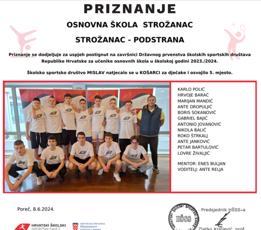 Na Državnom natjecanju iz košarke koje se proteklih dana održalo u Poreču, naši učenici su zauzeli vrhunsko 5. mjesto u državi. Nedostajalo je malo sportske sreće da se okite novom državnom medaljom, ali i ovako smo iznimno ponosni na njihov uspjeh kao i na njihove mentore i voditelje, kolege Enesa Buljana i Antu Relju.